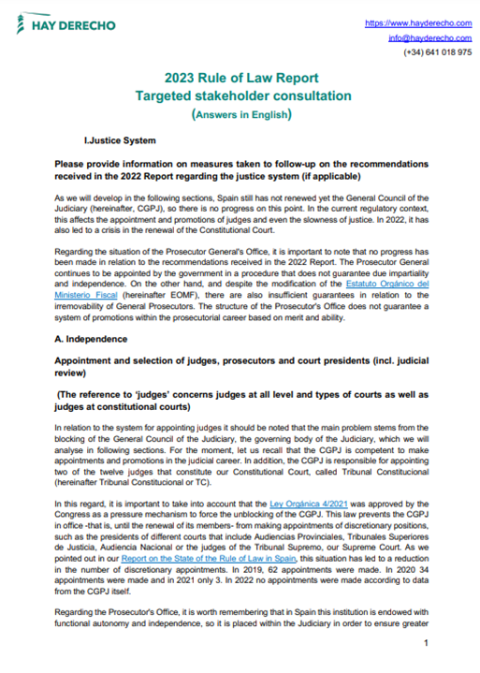 Hay Derecho Foundation is a civil society organisation founded in 2015 in Spain. It works to promote institutional regeneration, combat corruption and defend the rule of law. Hay Derecho Foundation has contributed to the European Commission's stakeholder consultation for the 2023 Rule of Law Report. The document includes its replies to the consultation's survey regarding the rule of law situation in Spain.