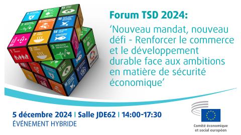 Trade and Sustainable Development (TSD) stands at a crossroads. As economic security takes centre stage in the EU's political agenda and ambitions, we need to make sure that TSD remains the guiding framework for trade and all EU policies. The third edition of the EESC Civil Society Forum on TSD, taking place on Thursday, 5 December from 14:00 to 17:30 at the EESC premises in Brussels – hybrid format - offers a unique opportunity to influence policy direction at the dawn of a new EU Commission.